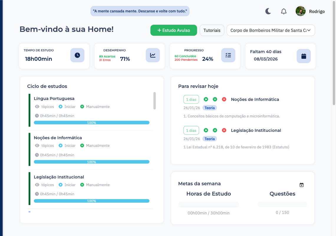 Clareza total do seu caminho até a aprovação. Acompanhe quanto do edital você já estudou, quantas questões resolveu, seu aproveitamento por matéria e muito mais. Dados visuais que mostram exatamente onde você está e quanto falta. Visualize seu progresso em tempo real com métricas claras e objetivas.