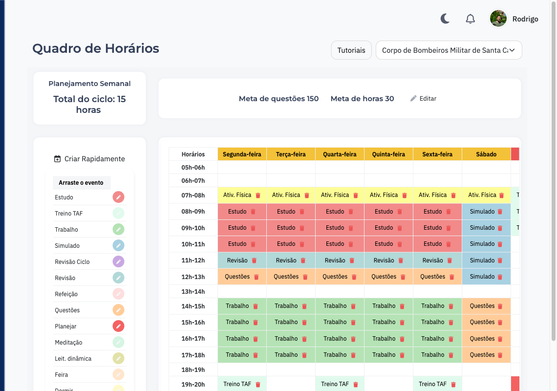Organize sua rotina semanal com horários de estudo, trabalho, descanso e lazer. Monte seu quadro de horários arrastando e soltando blocos de estudo. Defina horários fixos para cada matéria e mantenha a consistência na sua rotina. O sistema se adapta ao tempo que você tem disponível.